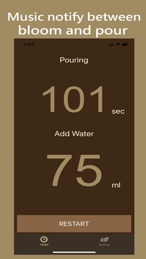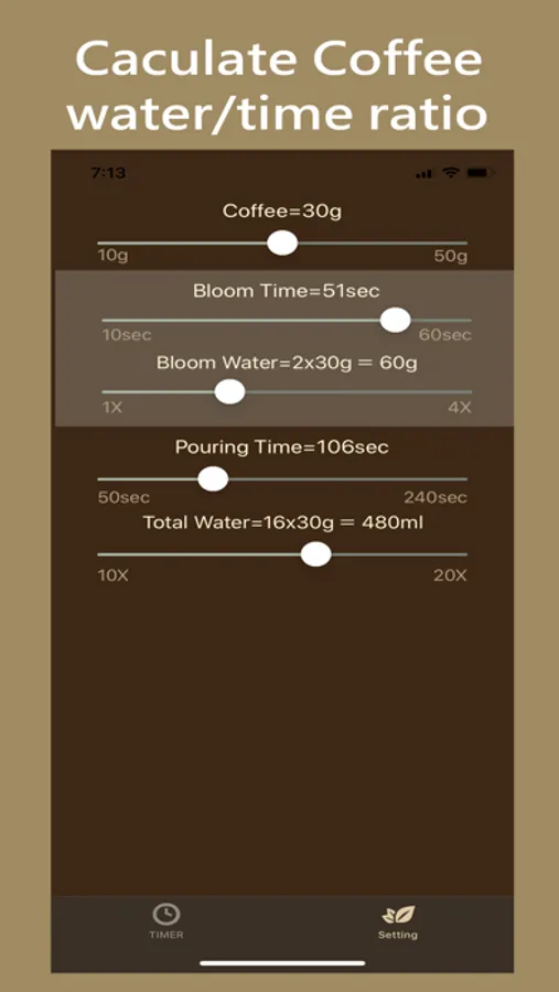 A pour over coffee timer.This APP shows the time for bloom and pour time and the pour water rate for your reference.It also calculate the water and coffee ratio automatically and save it for next time use.