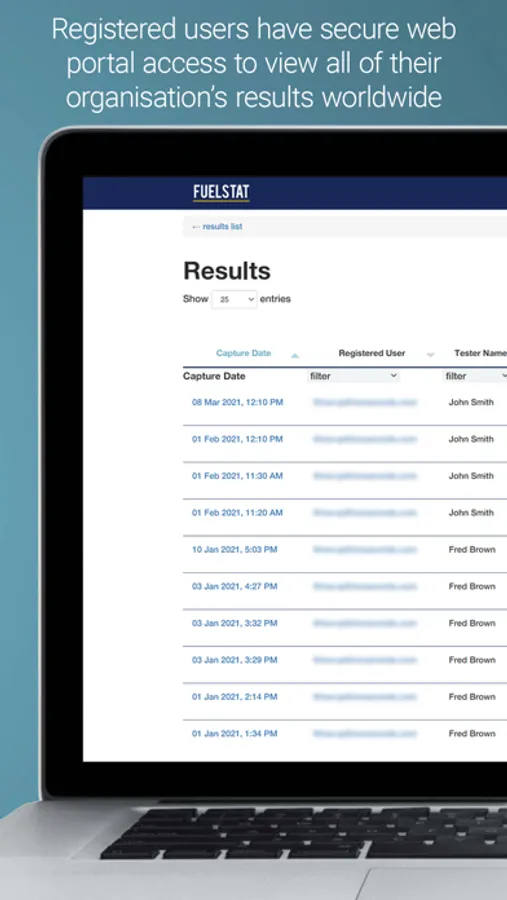 The full user experience of FUELSTAT® Result combines the app with a web Report portal, allowing organisations instant access to test results conducted anywhere around the globe. Managers have control to register their users and access the Report portal to track test results across all of their assets in real time.
