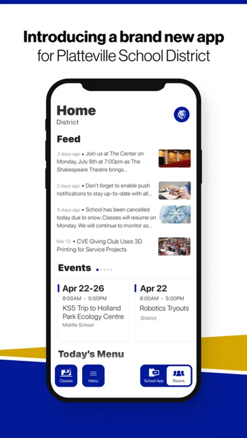 The event section shows a list of events throughout the district. Users can add an event to their calendar to share the event with friends and family with one tap.