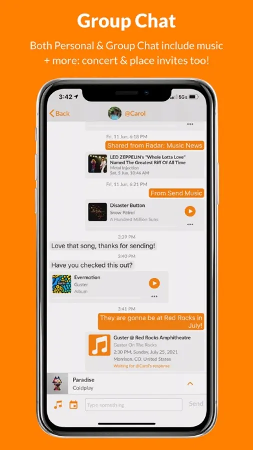 Personal (one to one) and Group Chat just like you are used to from whatever app you use for generic texting, but with Resonate purpose built for music.