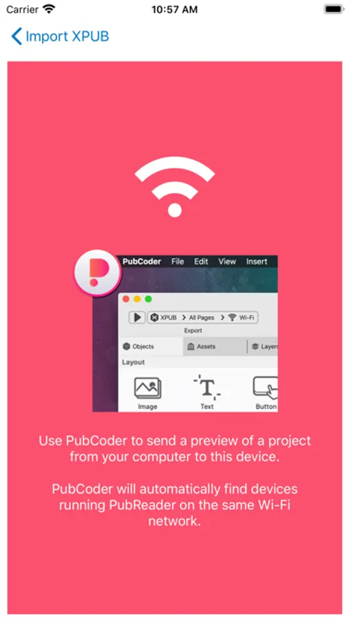 - Live Preview PubCoder projects: send your work to any smartphone or tablet using PubReader on the same Wi-Fi network with a click