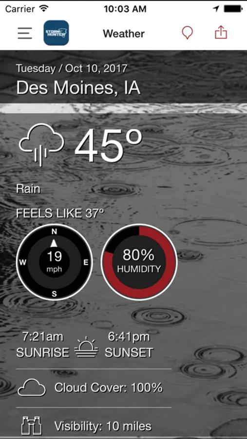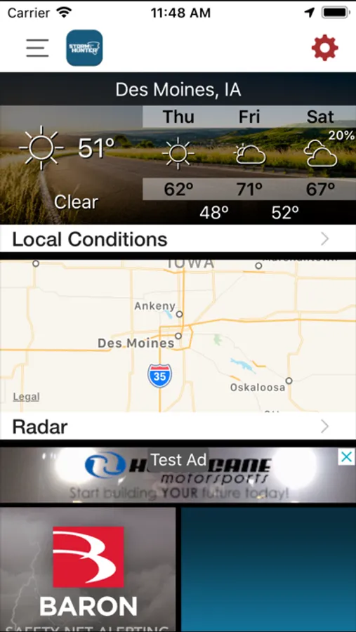 Storm Hunter includes five high resolution NWS radars covering Iowa. Select from radar intensity and velocity, plus one click threat delineation with the "Baron Button" breaking down storm cells into rain, hail and wind threats.