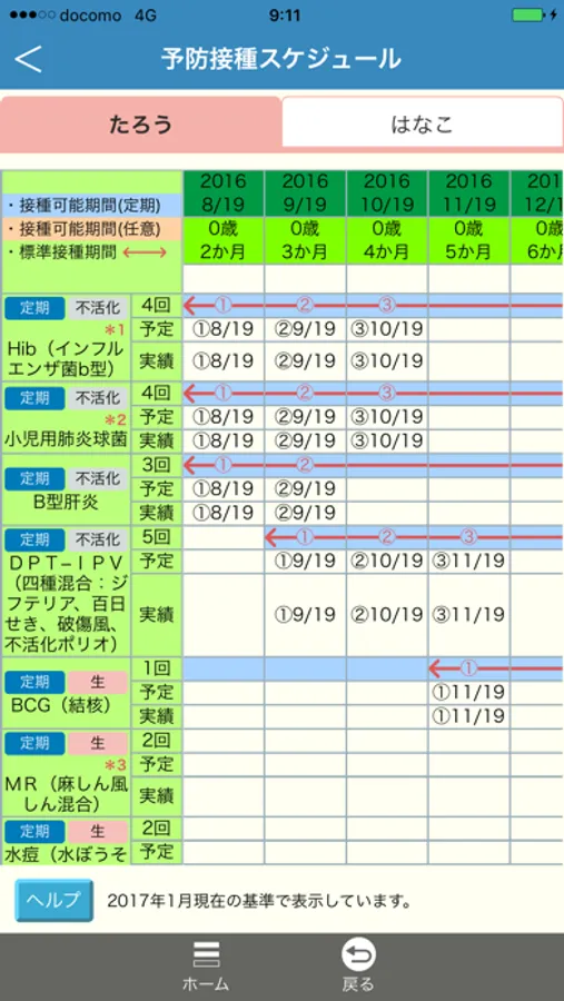 お子さんの予防接種の予定と接種実績を管理し、接種期間や接種間隔を考慮したアラートを表示します。