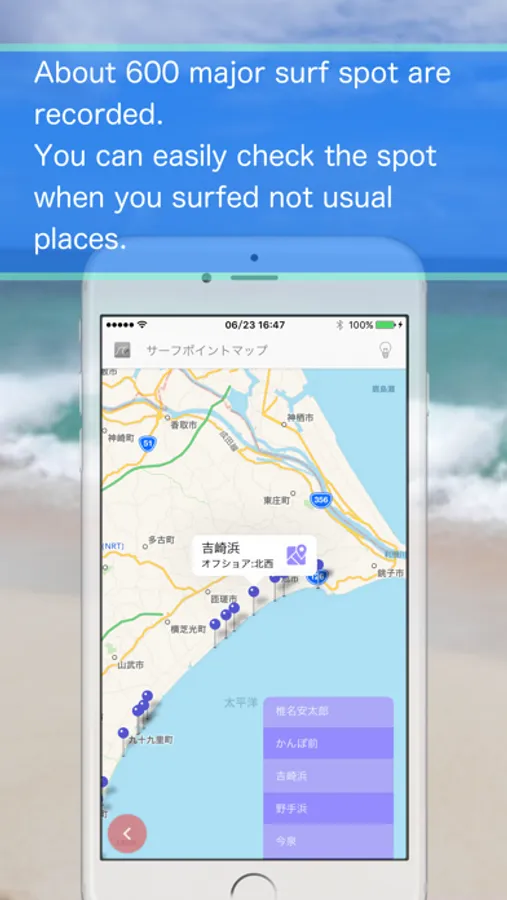 You can be selected surf spot from about 600 places included in the application in advance, or you can set your own spots.