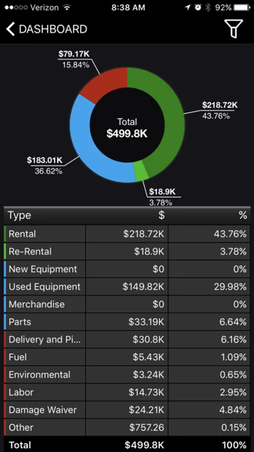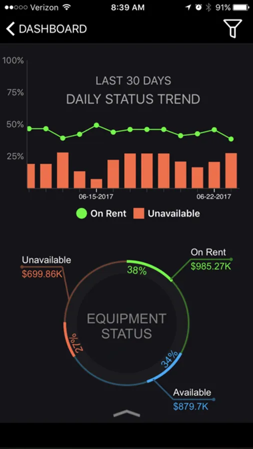 The Rental BI app is a tool for equipment rental businesses. Functionality includes KPI dashboards, rates and availability searches, activity feed viewing, and customer searches.