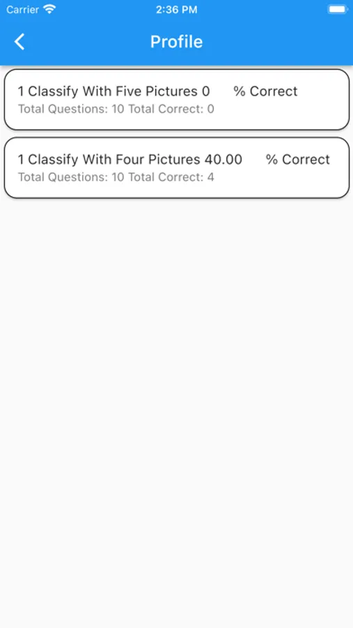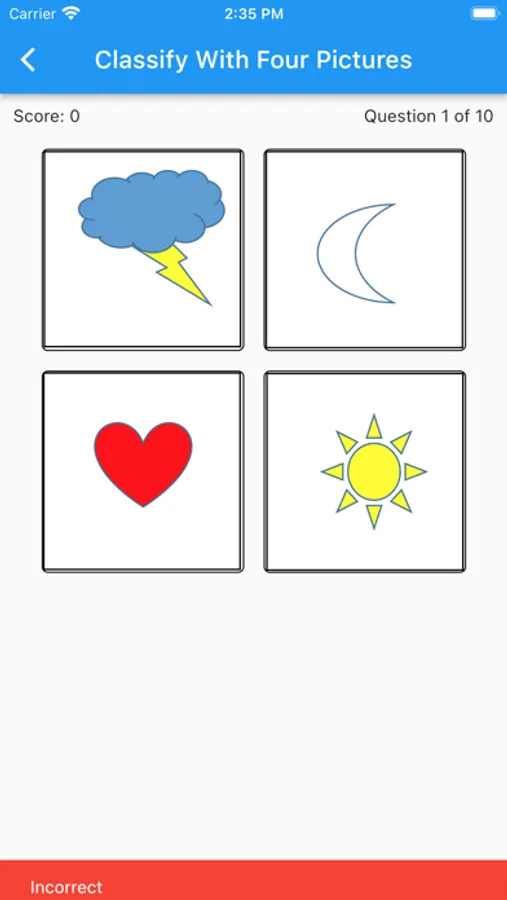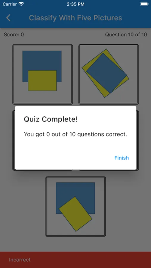 We present a quiz of 10 questions from a bank of questions stored in the app. You get a score and the number right/wrong as well as indication of correct answers when tapped.