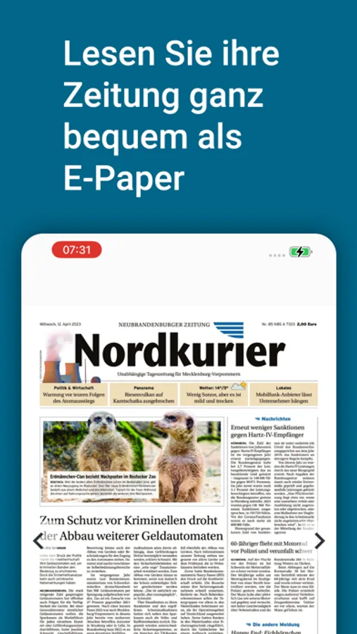 Mit dem E-Paper haben Sie als Abonnent Zugang zu allen 13 Lokalausgaben als klassisches 1:1-Abbild der gedruckten Tageszeitung. Es vereint alle Vorzüge der klassischen Tageszeitung in vertrauter Optik mit dem Komfort digitaler Features wie Zoom- und Vorlesefunktion sowie Archivzugang.