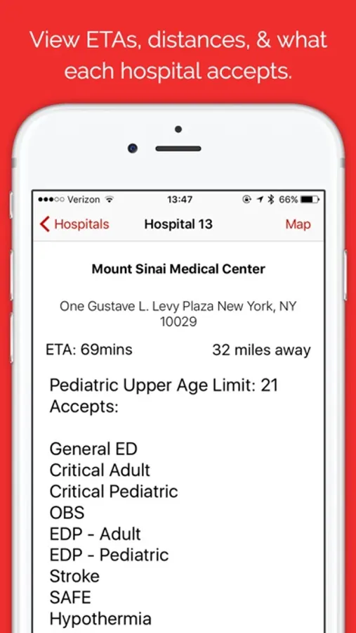-Hospital info such as address, accepting categories, ETAs, and distance from your current location