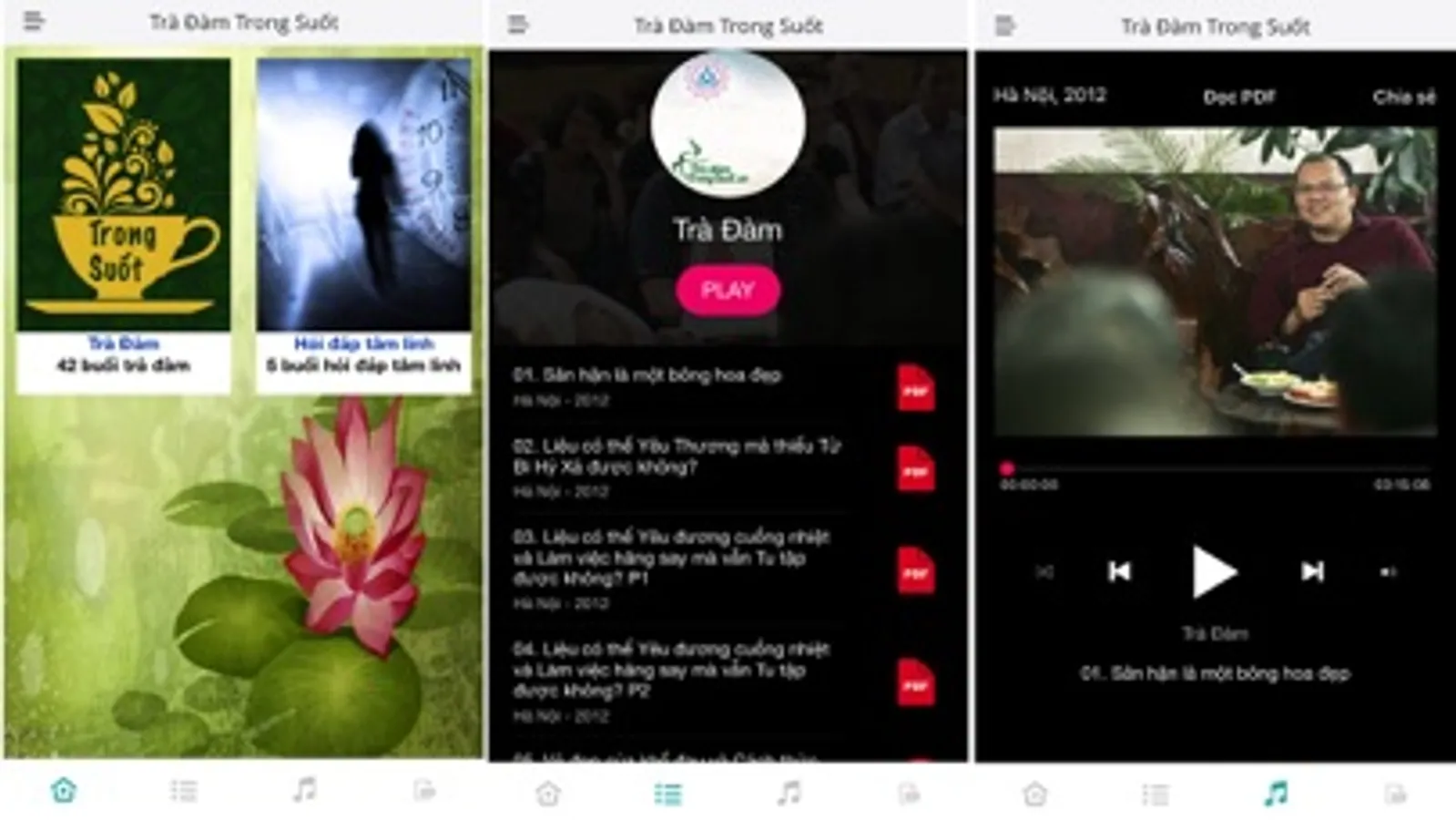 Hầu hết các buổi Trà Đàm đều được ghi âm, và rất nhiều buổi đã được đánh máy. Trang Facebook Trà Đàm Trong Suốt sẽ lần lượt giới thiệu một số trích đoạn, dành tặng những người bạn yêu quý của Trong Suốt. Bạn có thể nghe và đọc lại toàn bộ buổi nói chuyện từ đường link kèm theo. Hy vọng bạn sẽ tìm được điều gì đó có ích cho mình, và giúp mọi người cùng sáng thêm lên bằng tình yêu và hiểu biết.
