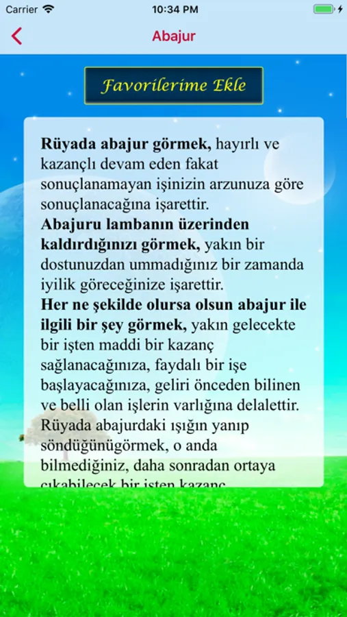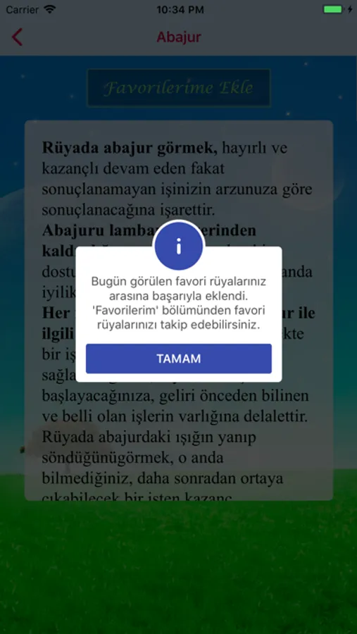 Görmüş olduğunuz rüyayı, rüya açıklamasını okuduktan sonra "Favorilerime Ekle" butonuna tıklayarak "Favorilerim" bölümüne ekleyebilirsiniz.