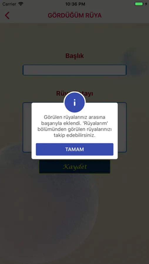 Ayrıca görmüş olduğunuz rüyaları uygulamada kaydedebilme özelliği de mevcut. Bu özellik sayesinde görmüş olduğunuz rüyayı 'Başlık' ve 'Rüya Detayı' nı yazarak uygulamaya kaydedebilir ve 'Rüyalarım' bölümünden de kendi eklemiş olduğunuz bu rüyaları tarihsel olarak takip edebilirsiniz.