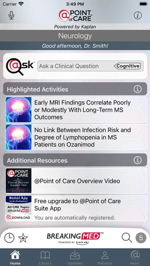 Neurology @Point of Care™ is a clinical decision-making mobile platform. Neurology @Point of Care provides a streamlined clinical decision support tool for clinicians to obtain neurology content when it is needed, keep track of their patients—enabling better decisions, better outcomes, and better care.
