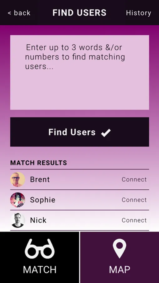 Out one night and want to chat with someone at the bar but don't have the nerve... or did time run out and you didn't get the chance to talk to that other person at the bar, or networking event, or conference, or place of interest... the possibilities are endless and Find Me app ensures you don't miss out on making all the connections you can!