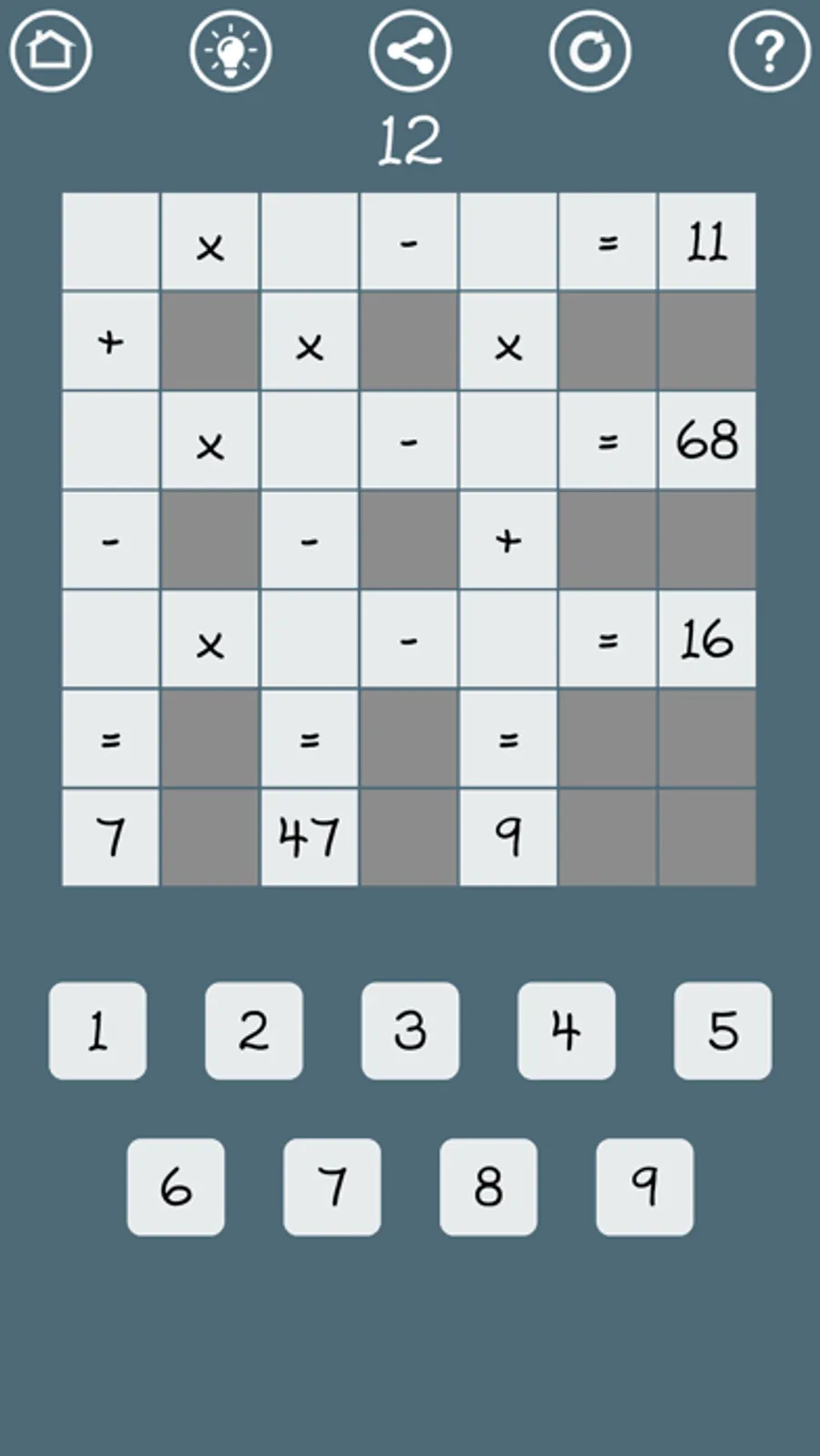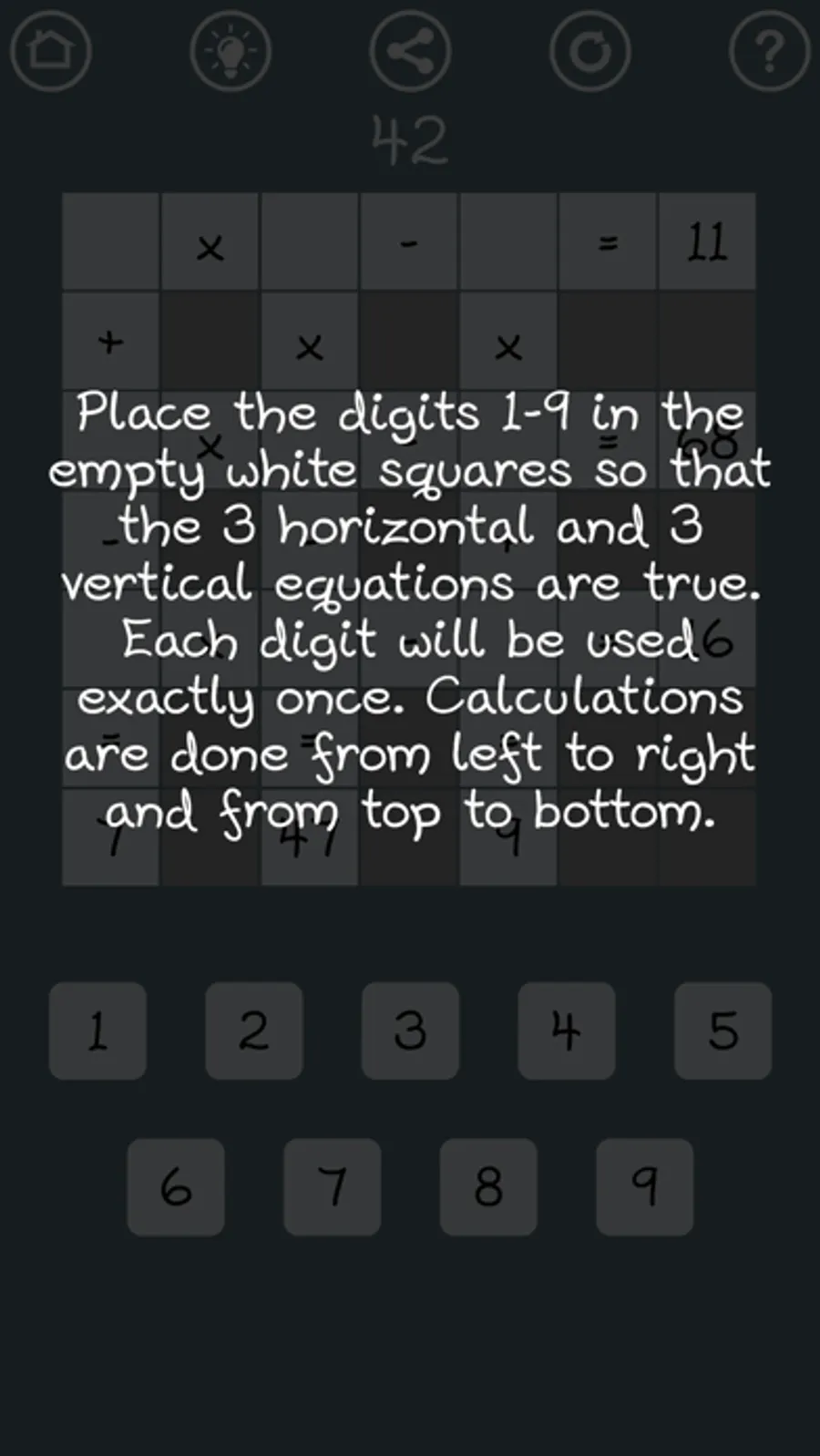 It similar to a crossword puzzle. The goal is to fill the empty spaces using only 1-9 to fulfil all the equations on the board.