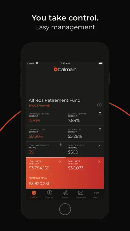 The Balmain Private App displays live data giving visibility and easy access to your entire portfolio of Sub-Trusts. Toggle between your accounts. Compare your performance to Balmain using Rate and LVR. View the status of both Cash Units and Loan Units.