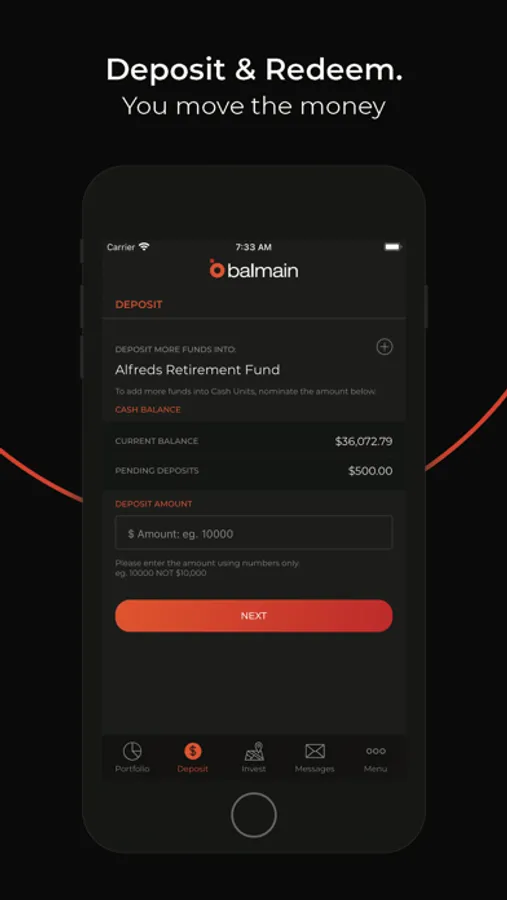 Get primed to invest. Move money from your bank to your Balmain Private Cash Units account. Your Cash Units sit in a Cash Management Account till you choose to invest. When required, redeem Cash Units back to your nominated bank account.