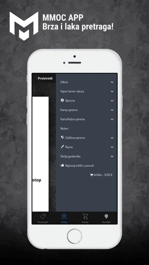 - MMOC aplikacija je aplikacija gde na jednom mestu možete pronaći sve što vam treba od vojne opreme i odeće.