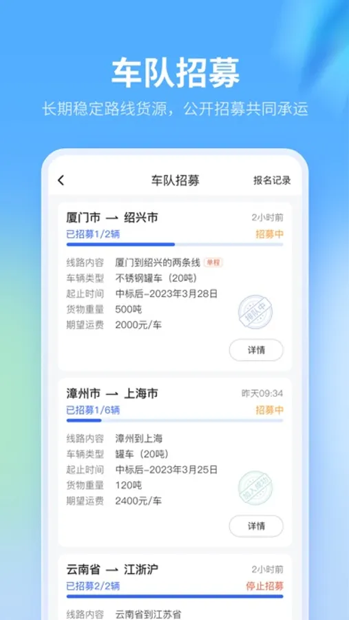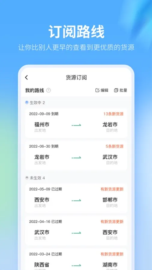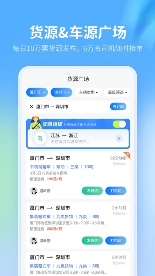 是不是经常辛苦一整天都找不到货源?打开危化镖局app,高达5条/秒的货源推送速度,让你一天收获全国100000条货源。订阅线路,有货实时提示,让你每趟货运满满不空车。作为危化货运界的“滴滴”,为数百万卡车、罐车、货车、回头车司机车主提供更高效更方便的赚钱方式。