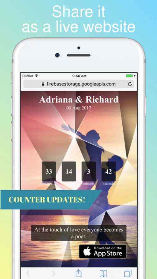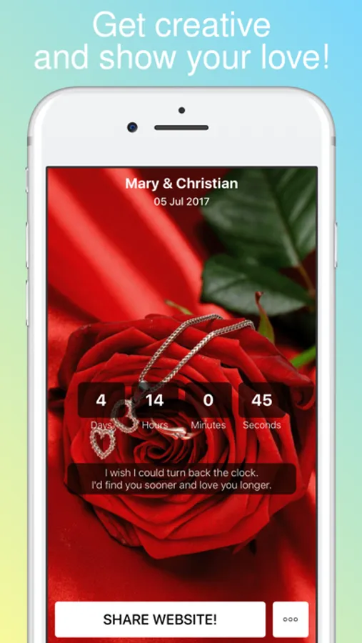 Share your love with your friends or your spouse. Create a live website that updates every second and share it on social media or wherever you want. It looks awesome and builds up the expectations! It's also compatible with every device, including laptops, tablets and smartphones!