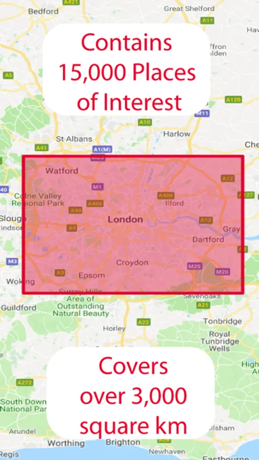 This version is for London and locates places in and around London City Center and the wider London Area. It reaches a rectangle stretching around the M25 from Slough in the West to Gravesend in the East, and Watford in the North to Leatherhead in the South. In total an area of over 3,000 km2.