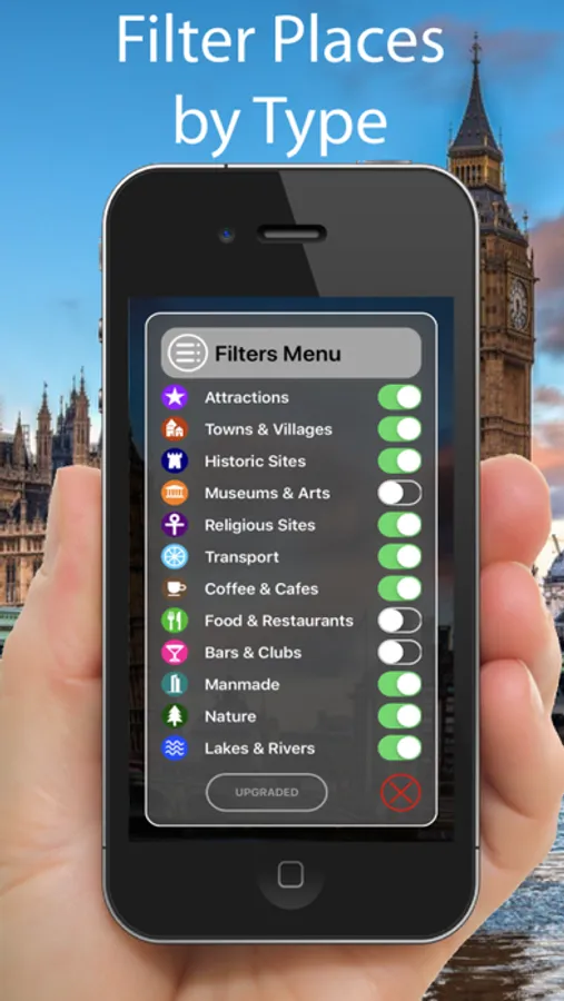 Categories that can be viewed and selected include Tourist Attractions, Hills, Lakes, Parks & Woodlands, Cities, Towns, Suburban Areas, Villages & Hamlets, Cafes, Restaurants, Cafes, Airports, Train & Major Bus Stations, Municipal Buildings, Places of Worship, Historic Sites and Museums & Arts.