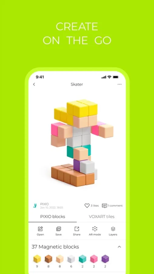 The PIXIO app provides a wide range of opportunities for creators and fans of pixel and voxel art. Create your 3D pixel art in the Studio. Post it in the art feed. Get feedback from the community in the comments. Follow your favorite artists and constantly update your art collections. Get inspired by thousands of artists around the world and participate in competitions. Get real magnetic blocks to bring your creative ideas created in the app to life. All this is waiting for you in the new PIXIO app!
