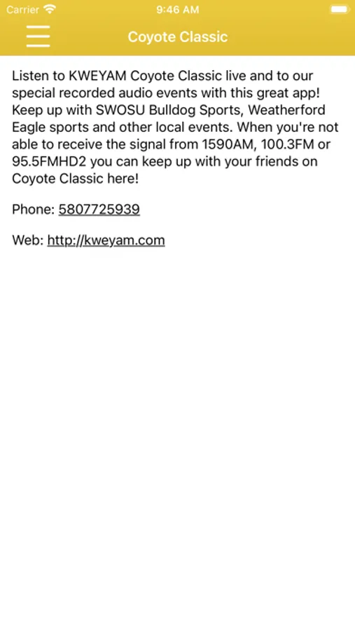 Listen to KWEYAM Coyote Classic live and to our special recorded audio events with this great app! Keep up with sports and other local events. When you're not able to receive the signal from 1590AM, 100.3FM or 95.5FMHD2 you can keep up with your friends on Coyote Classic here!
