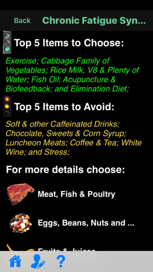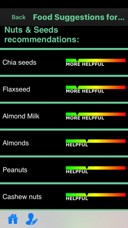 • ACTIONABLE information on what is good, what is bad, and what is neutral for your condition(s). We single out specific food items, and give you an ordered list of helpful and harmful foods within each food group.