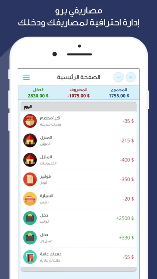 بامكانك اضافة اي دخل او مصروف وتنظيم حياتك المالية بكل سهولة وبشكل مميز