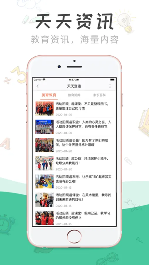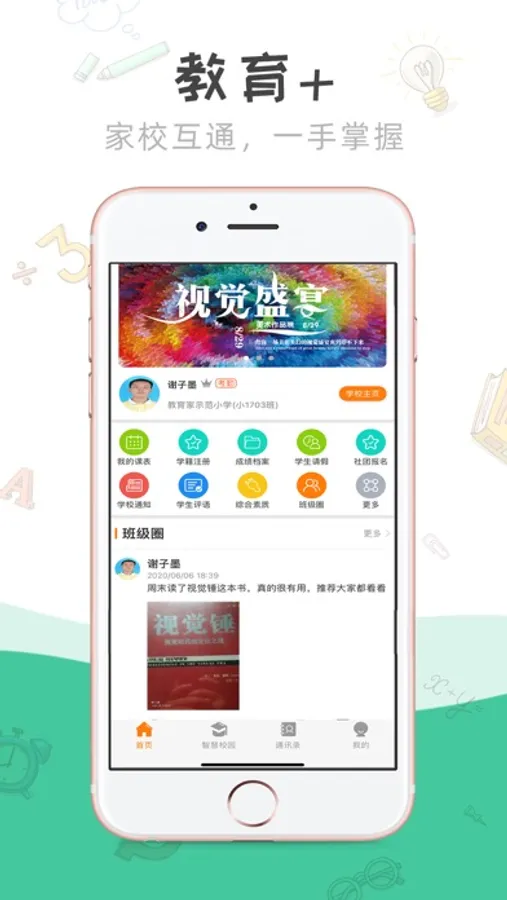圈,提供信息分享渠道,增进互动交流和情感融合;提供教育行业动态、学生课表、家庭作业、考试成