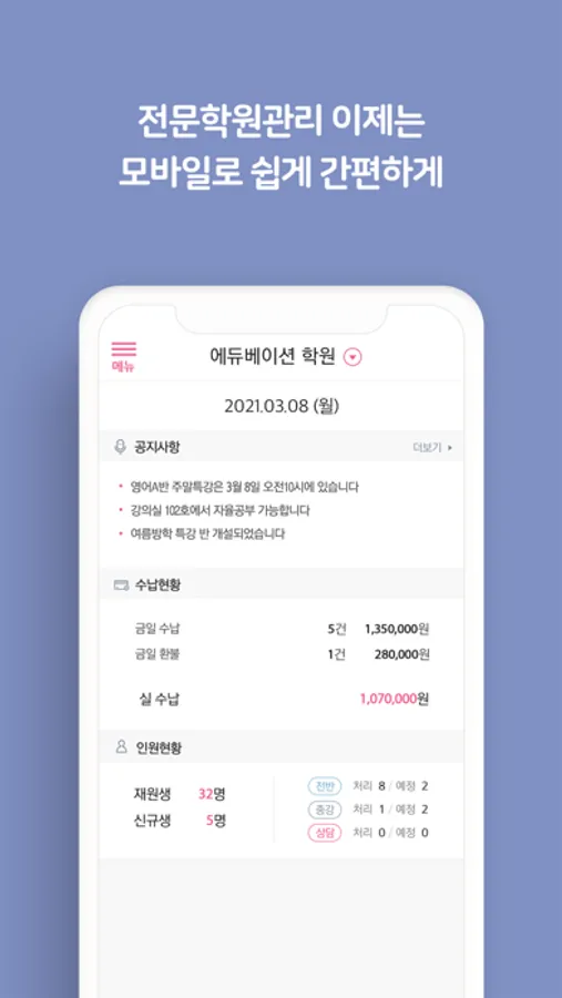 3. 월별 수납/퇴원/출결 현황 조회, 일일 수납/퇴원/환불 관리를 통해 체계적인 학원 관리가 가능합니다.