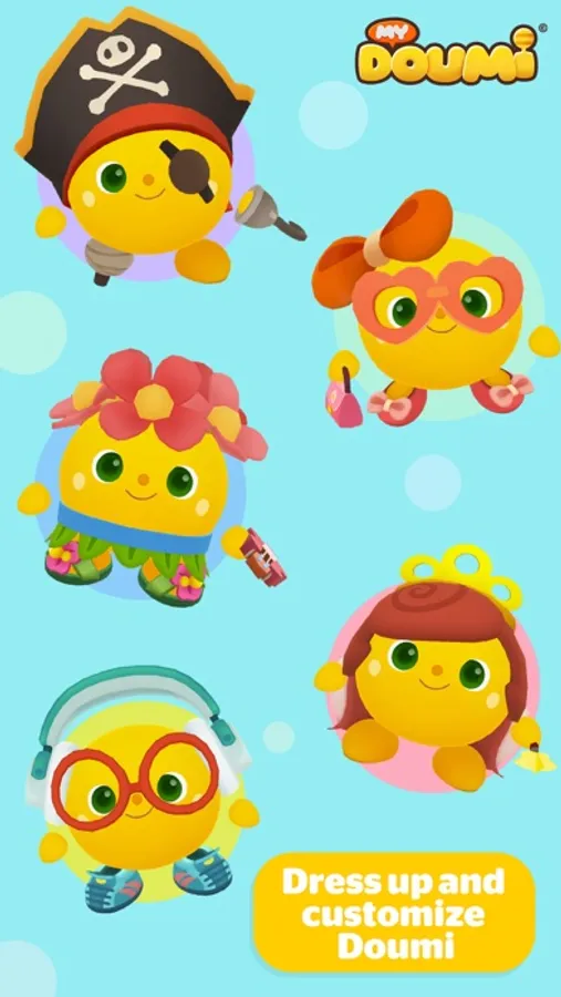 Personalize your Doumi with a unique name before you eat, wash and play games together to keep them happy and healthy! Taking care of Doumi will help them level up and evolve. Further customize Doumi’s appearance by mixing and matching tons of cool outfits to create a unique look!