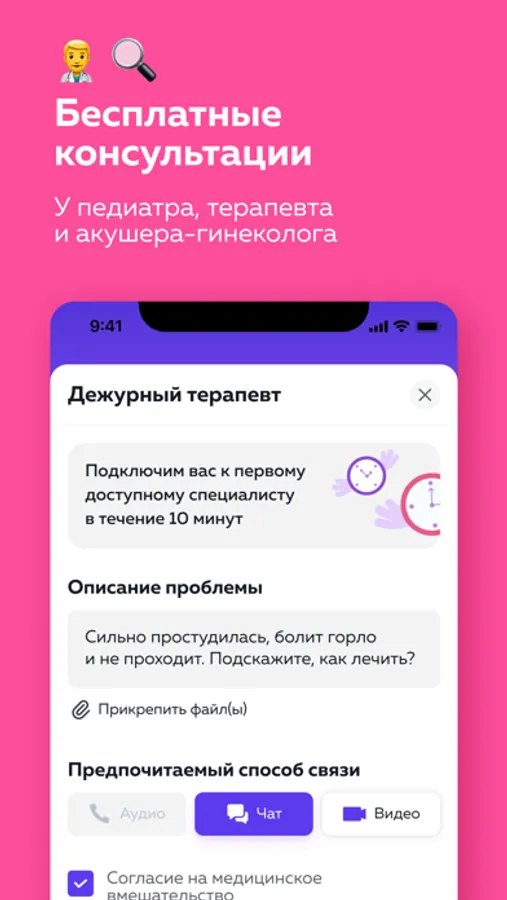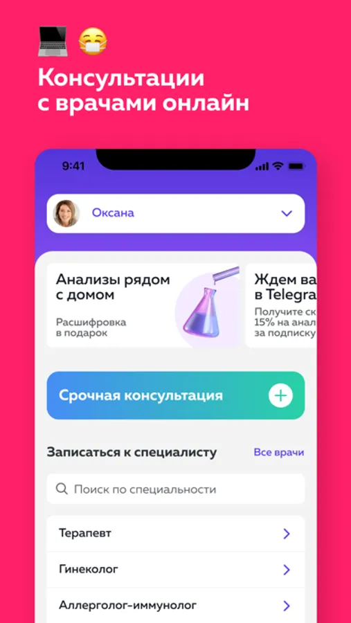 Records of communication with a doctor, results of analysis and other tests, medical history and all information necessary for the diagnosis and treatment are stored in one place. You no longer need to carry a paper medical card.