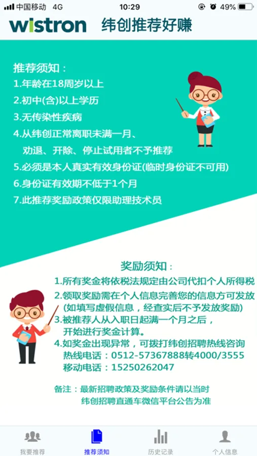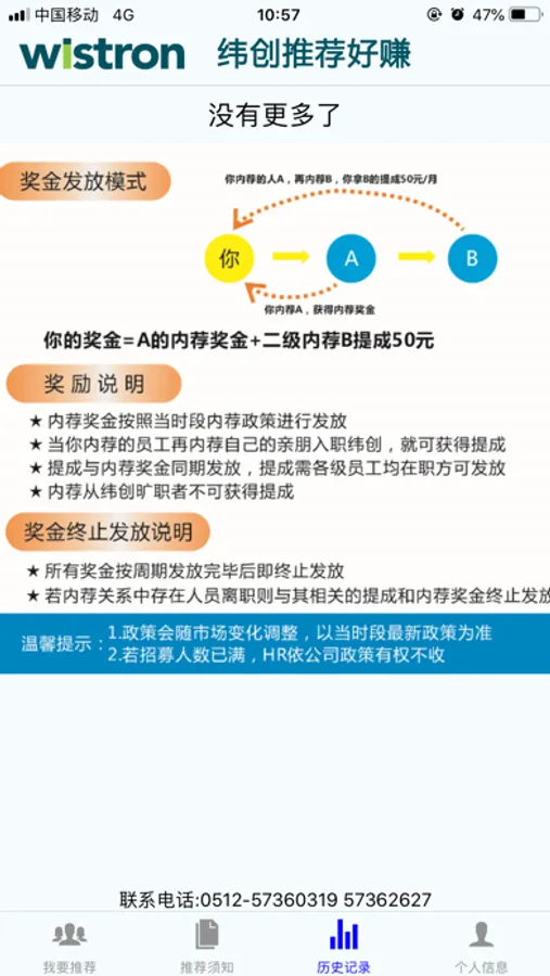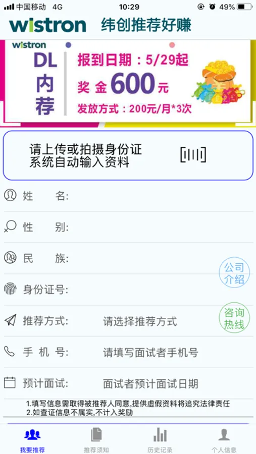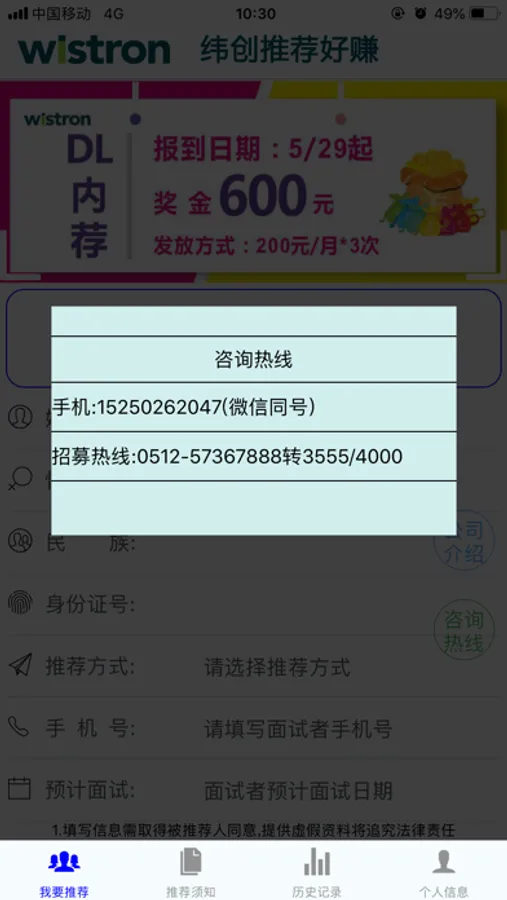 2.历史页面,可以查看自己已经推荐的人员信息及状态。