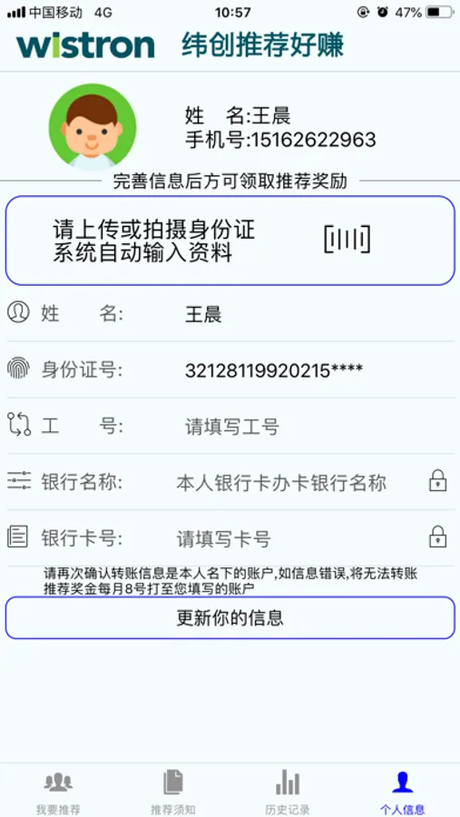 3.我的页面,可以完善自己的身份信息及联系方式,领取推荐奖励。