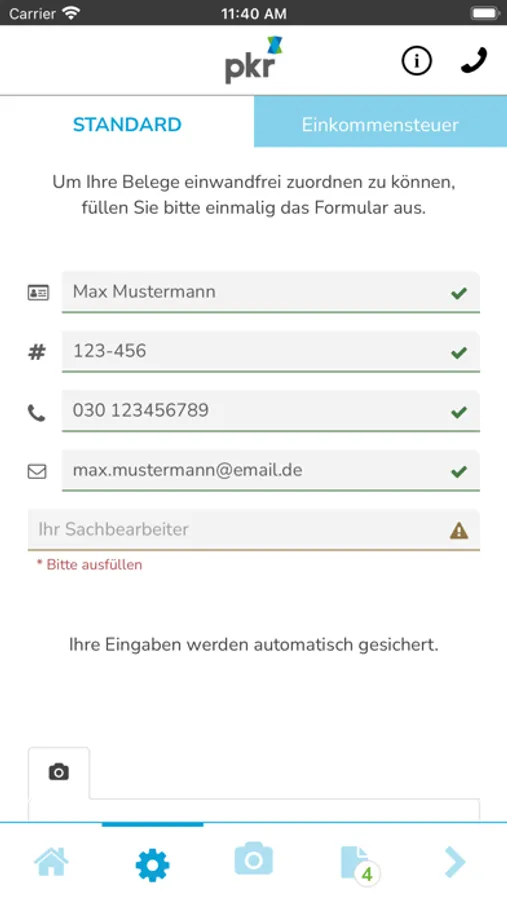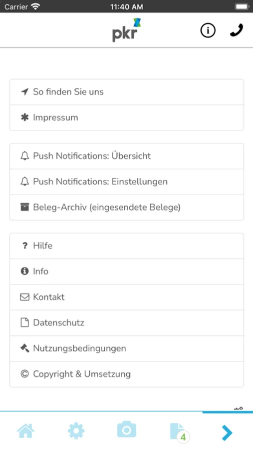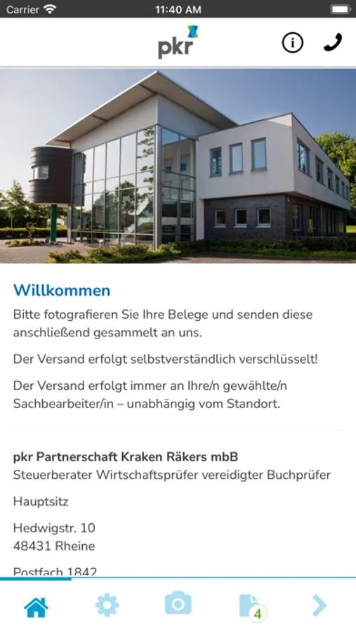 Mithilfe dieser App können Sie Belege, Dokumente und andere Schriftstücke schnell, sicher und komfortabel an pkr Partnerschaft Kraken Räkers mbB gesendet werden.
