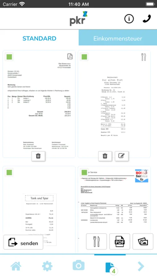Machen Sie einfach ein oder mehrere Fotos von Ihren Belegen und versenden Sie diese mit einem Klick direkt aus der App heraus an pkr Partnerschaft Kraken Räkers mbB