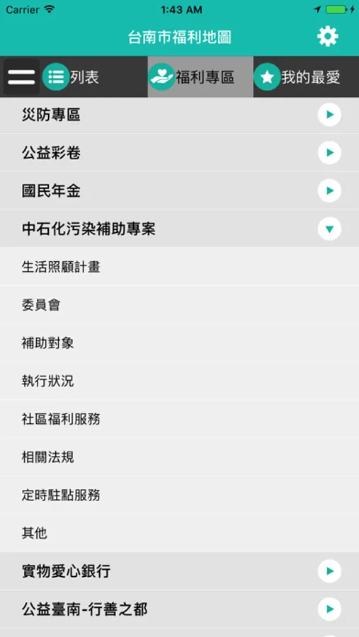 2.福利e指通: 提供臺南市政府社會局所提供的相關福利措施查詢,並連結至臺南市政府社會局網頁,您可以查詢到更詳細的申請辦法及相關法令規定。