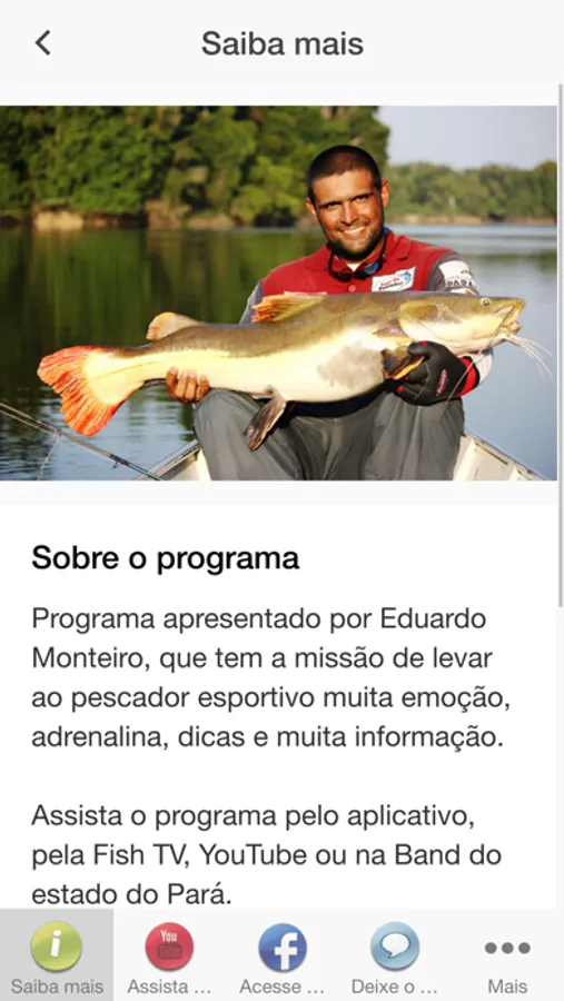 "Programa apresentado por Eduardo Monteiro, que tem a missão de levar ao pescador esportivo muita emoção, adrenalina, dicas e muita informação.