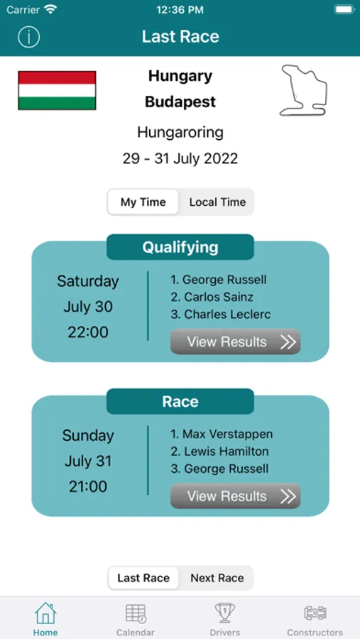 Quickly access the latest results, and a countdown to the next race
