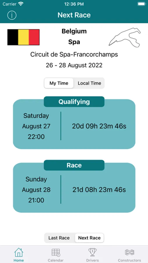 Quickly see the next race location, with a countdown to qualifying and the race
