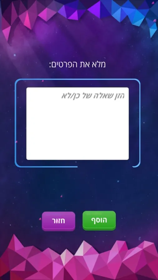 יש לכם אפשרות להפוך אותה טובה עוד יותר, כי הוספנו אפשרות עבורכם שתוכלו להוסיף שאלות מעניינות למאגר, ותקבלו פידבק מהמשתמשים!