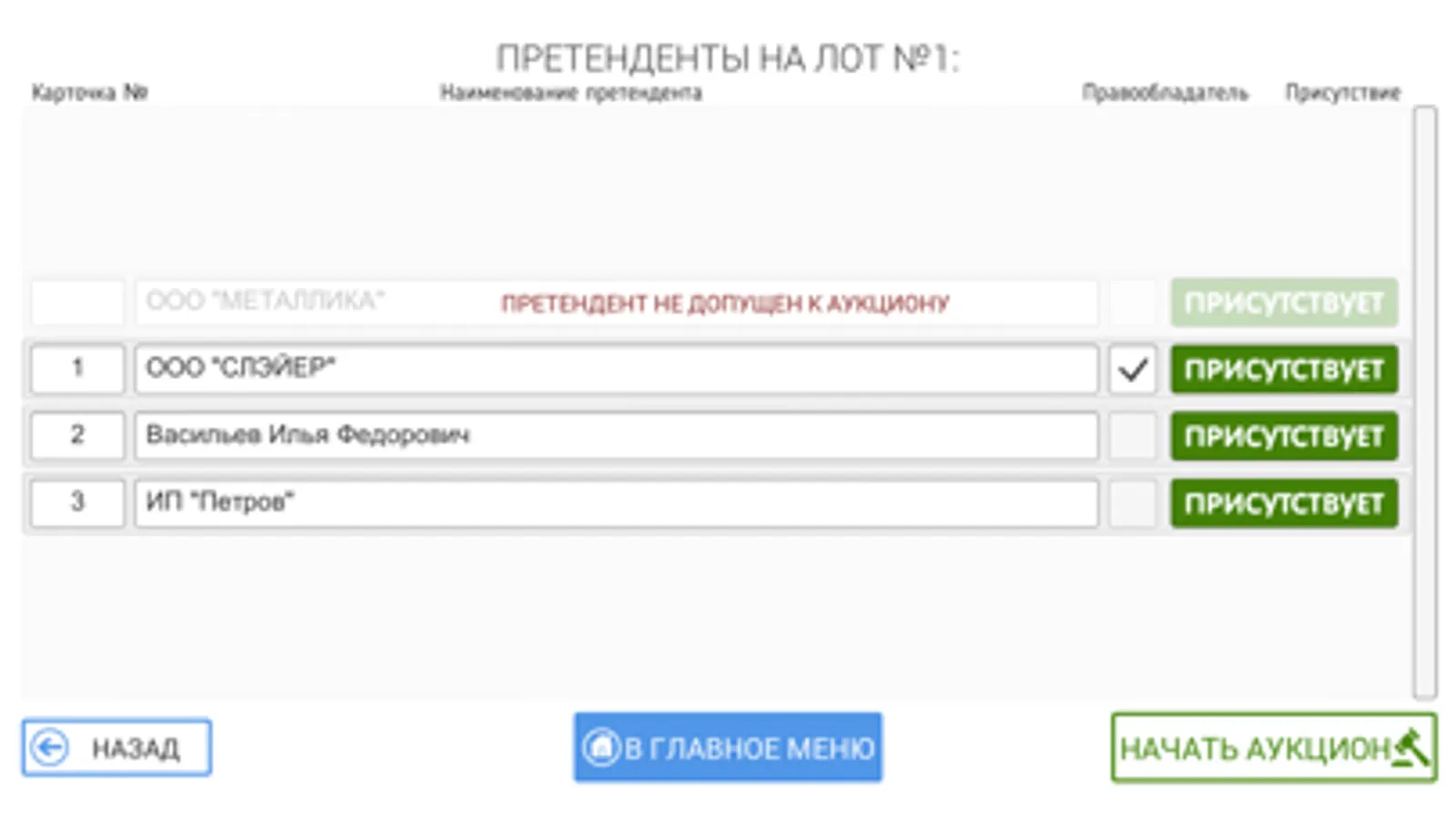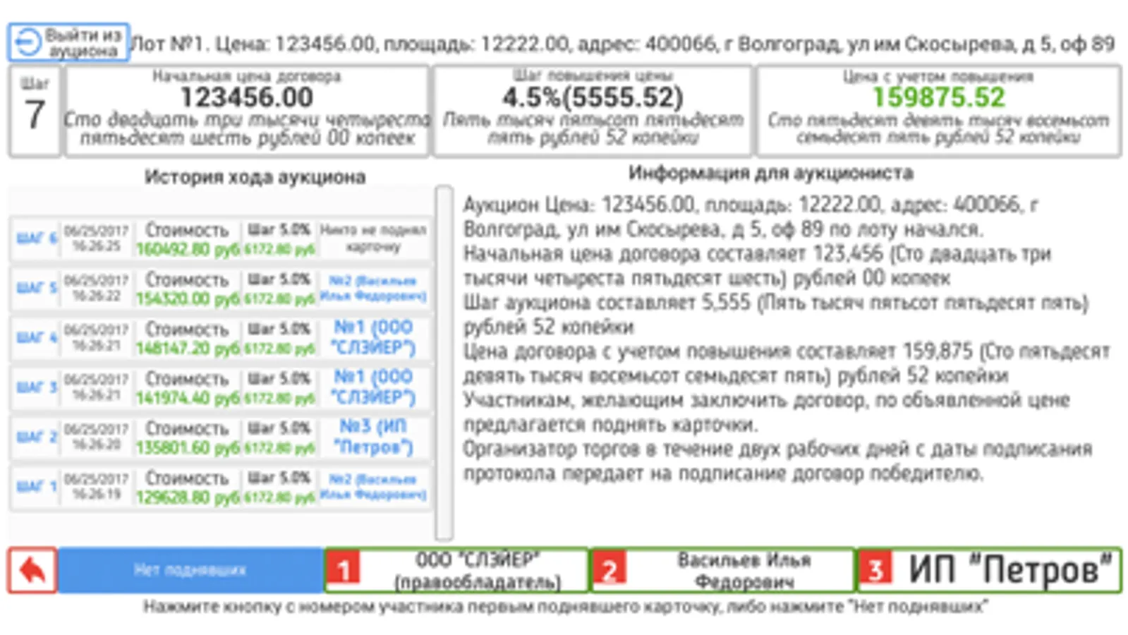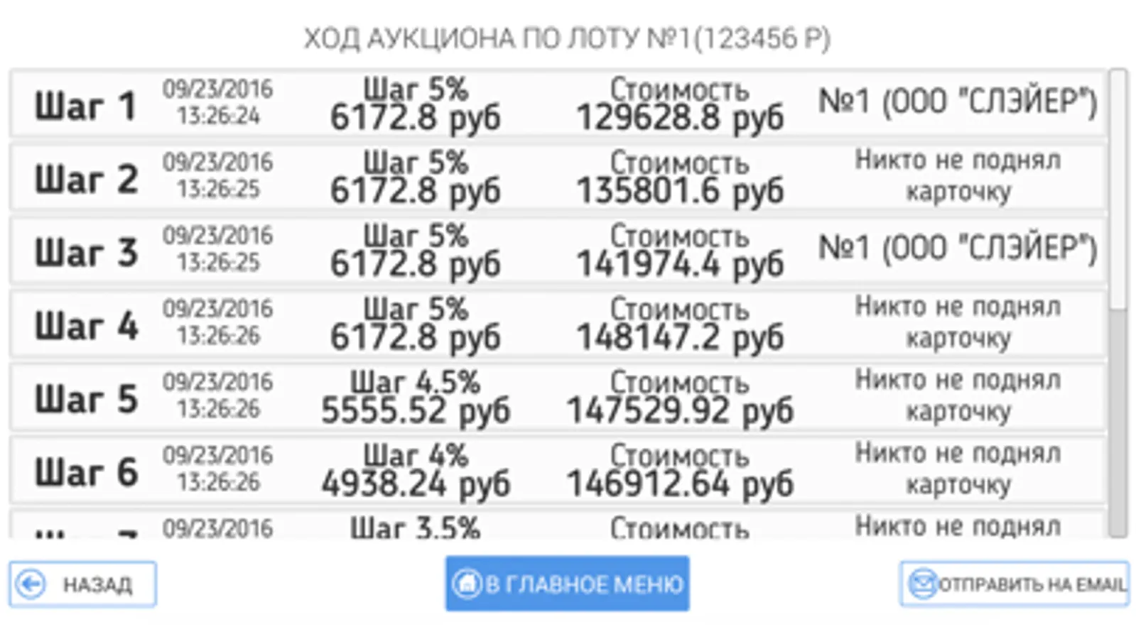 - программа позволяет аукционисту видеть всю картину хода аукциона, что позволяет исключить малейшую ошибку при проведении аукциона