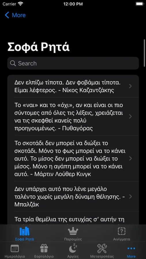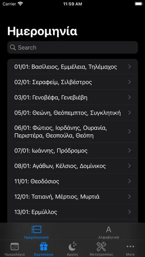 - Εύρεση ονομαστικής γιορτής (γραπτή αναζήτηση, ανά ημερομηνία, αλφαβητικά)