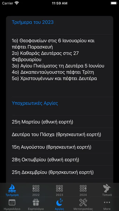 - Χρήσιμες πληροφορίες (πχ. εποχή, ώρες κοινής ησυχίας, ζώδια, παγκόσμιες ημέρες)