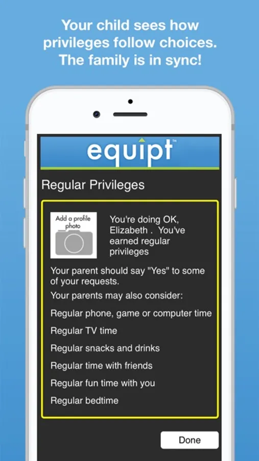 Equipt's patent-protected system is easy to set up. Support is available during ongoing use to help you experience success. Equipt includes synchronized displays on both parent and child devices. This helps parents and children remain in sync and creates harmony in the home.