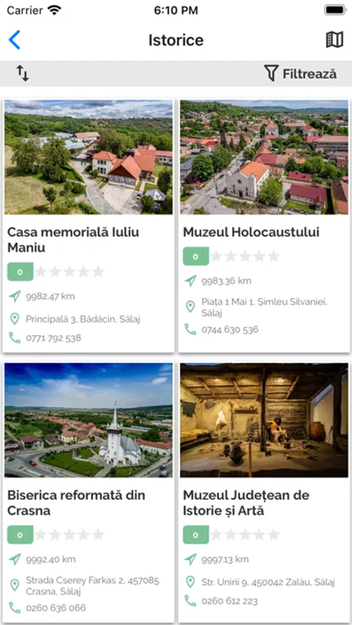 Toate elementele pot fi sortate alfabetic sau dupa distanta. De asemenea, se pot folosi optiuni de filtrare, in functie de tipul de punct de interes.