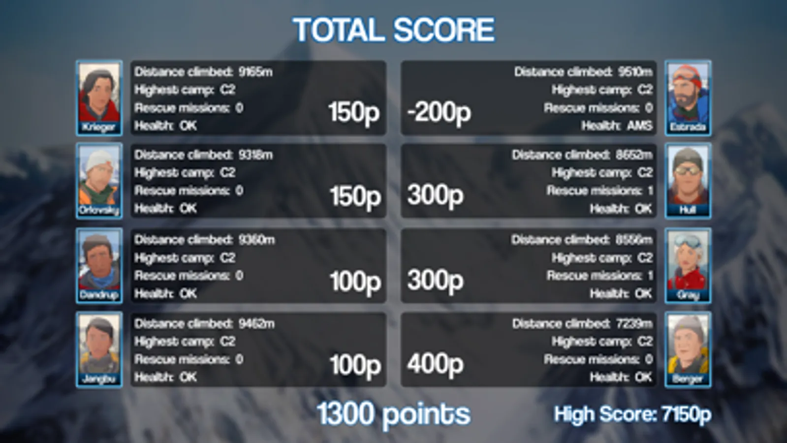 Battle the cold, the thin atmosphere, the wind and the snow! Do your best to avoid debilitating medical conditions! React to dramatic and dynamic weather conditions! Stay alive in the death zone!