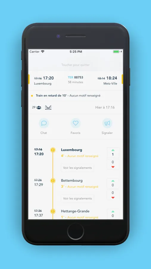 En plus d'y trouver les informations remontées par la SNCF, vous pourrez vous même soumettre vos propres constatations, non seulement retards et annulations mais en plus toute une gamme d'informations relatives à votre confort : problèmes de chauffage/climatisation, portes ou WC défectueux, etc. Vous rejoindrez ainsi la première communauté d'information ferroviaire en temps réel et resterez constamment informé des aléas de votre voyage.