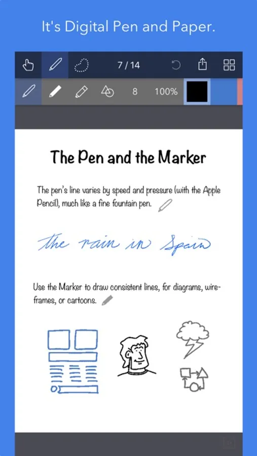 Create layered drawings without layers: Use the highlighter tool to color and shade behind existing ink. Use Color-Select to separate and edit individual colors. It's a much more fluid and natural editing experience than with layers. Use the straight-line tool with a grid for fast and intuitive wireframes and drafting.
